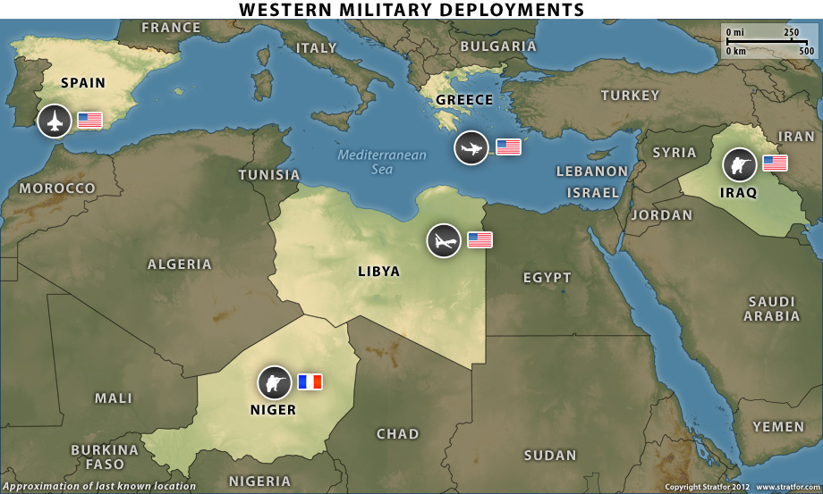 Το Stratfor επισημαίνει και την αυξημένη κινητικότητα των Γαλλικών Ενόπλων Δυνάμεων στη βόρεια Αφρική ,όπου το Παρίσι ανέπτυξε ειδικές δυνάμεις στη νότια Σαχάρα και στο βόρειο Μαλι. Αμερικανικές δυνάμεις έχουν εντοπιστεί στη Λιβύη.