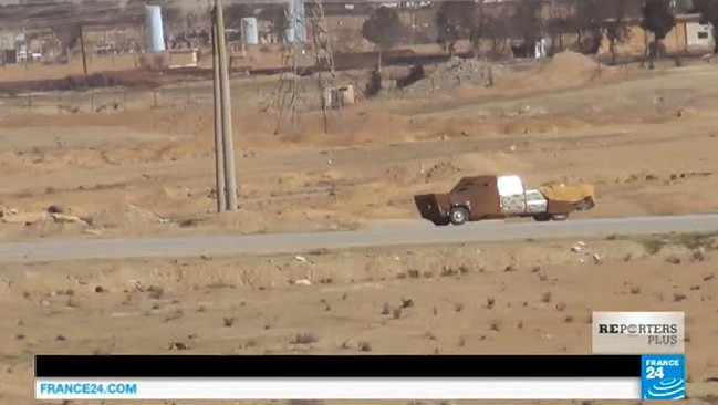Το πλάνο δεν ειναι απο ταινία δράσης ειναι πραγματικό και γυρίστηκε στη Συρία.  Το βίντεο, δείχνει τη στιγμή που ένα αυτοκίνητο τύπου Mad Max, του Ισλαμικού Κράτους ανατινάσσεται στον αέρα. Το όχημα ειναι θωρακισμένο με μεταλλικές πλάκες σε μια προφανή προσπάθεια να αποτρέψει τις σφαίρες.