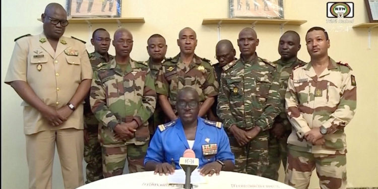 Δέκα πραξικοπηματίες αξιωματικοί των ενόπλων δυνάμεων και των σωμάτων ασφαλείας του Νίγηρα, χώρας της Αφρικής που αιματοκυλίζουν οργανώσεις τζιχαντιστών, ως τώρα συμμάχου-κλειδιού της Δύσης στο Σαχέλ, ανακοίνωσαν τη νύχτα της Τετάρτης προς Πέμπτη μέσω της κρατικής τηλεόρασης πως ανέτρεψαν τον δημοκρατικό εκλεγμένο πρόεδρο Μοαμέντ Μπαζούμ, στην εξουσία από το 2021.
