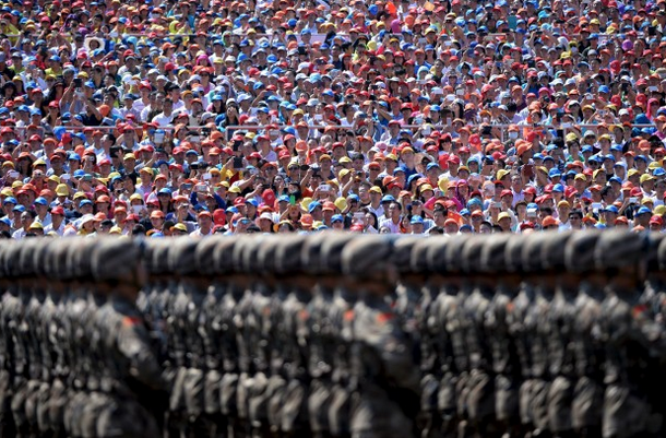 «Η Κίνα ουδέποτε θα επιδιώξει την ηγεμονία, ούτε θα επιδιώξει να επεκταθεί. Ουδέποτε θα επιβάλει τραγικά δεινά σε άλλες χώρες», δήλωσε ο πρόεδρος Σι, πριν επιθεωρήσει τα στρατεύματα, όρθιος μέσα σε λιμουζίνα στην λεωφόρο της Ουράνιας Ειρήνης, κάτω από έναν καθαρό ουρανό κι έναν λαμπερό ήλιο. «Ανακοινώνω εδώ ότι η Κίνα θα μειώσει τις στρατιωτικές δυνάμεις της κατά 300.000» άνδρες, δήλωσε ο Σι Τζινπίνγκ κατά την ομιλία του από την «Πύλη της Ουράνιας Ειρήνης», απ’ όπου ο Μάο Τσε-τουνγκ είχε κηρύξει την ίδρυση της Λαϊκής Δημοκρατίας της Κίνας την 1η Οκτωβρίου του 1949.
