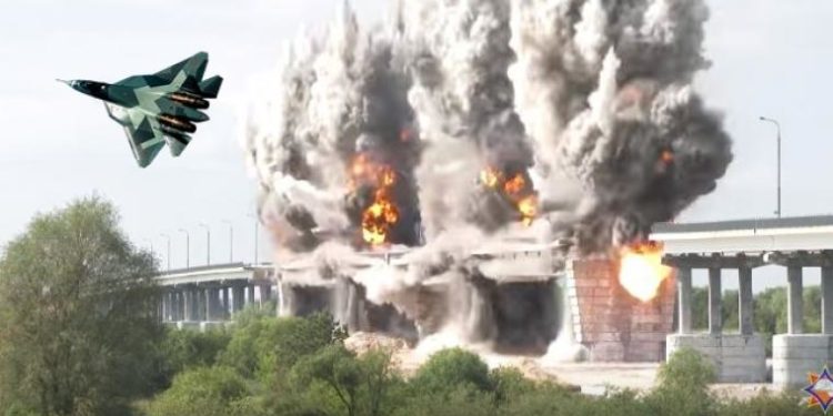 Πρόκειται για ένα ενσωματωμένο βίντεο σε άρθρο της lenta.ru (ανήκει στον στενό συνεργάτη του Vladimir Putin, Vladimir Potanin), που απεικονίζει την κατεδάφιση μιας γέφυρας στην Λευκορωσία, μέσω βομβαρδισμού ακριβείας από Su-57. Πρέπει να επισημάνουμε σε αυτό το σημείο ότι το βίντεο δεν παρουσιάστηκε μέσω επίσημων ρωσικών καναλιών (Υπ. Άμυνας κτλ).