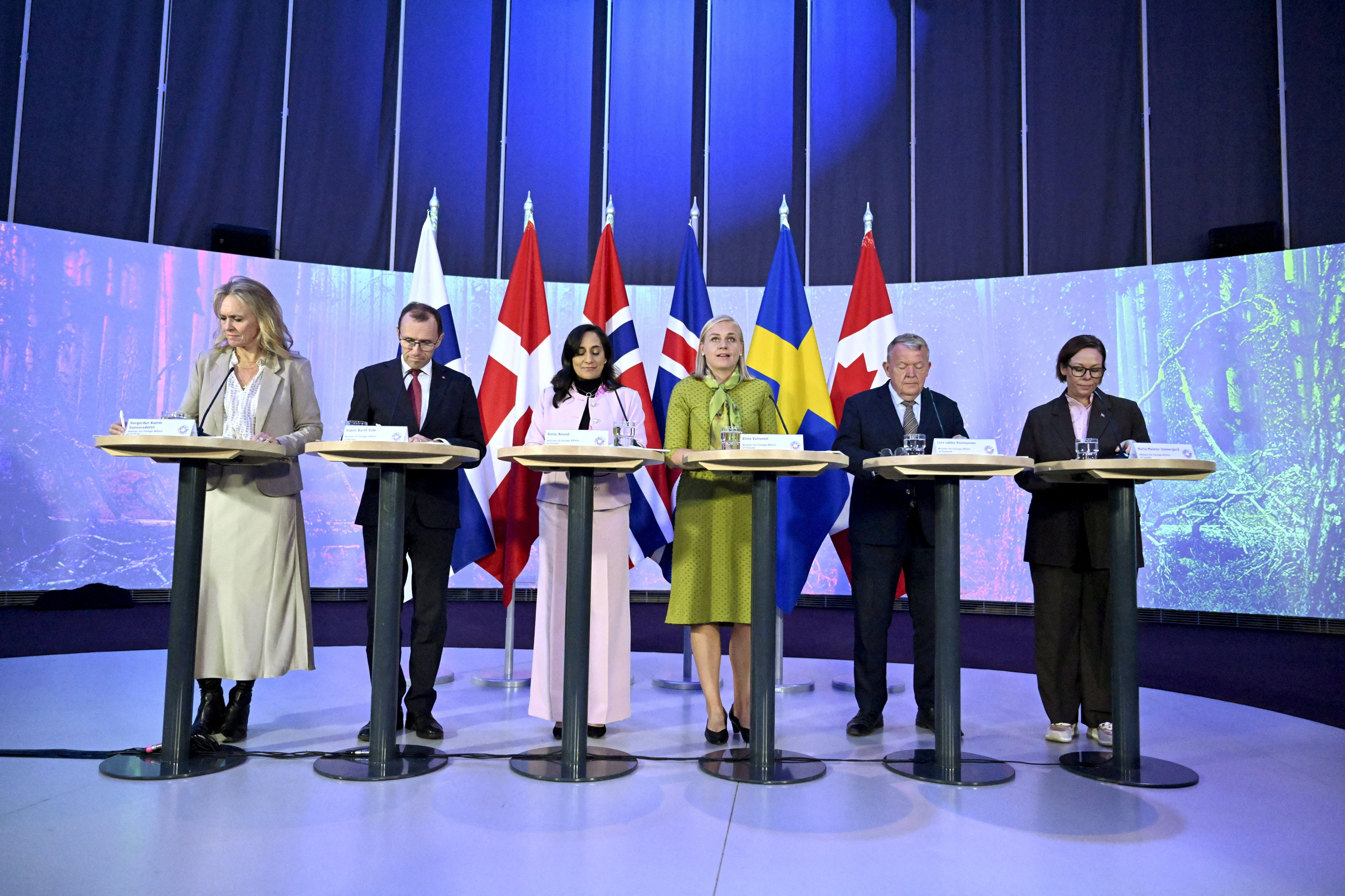 (Από αριστερά) Η υπουργός Εξωτερικών της Ισλανδίας, Thorgerdur Katrin Gunnarsdottir, ο Υπουργός Εξωτερικών της Νορβηγίας Espen Barth Eide, η Υπουργός Εξωτερικών του Καναδά Anita Anand, η Υπουργός Εξωτερικών της Φινλανδίας Elina Valtonen, ο Υπουργός Εξωτερικών της Δανίας Lars Lokke Rasmussen και η Υπουργός Εξωτερικών της Σουηδίας Maria Malmer Stenergard