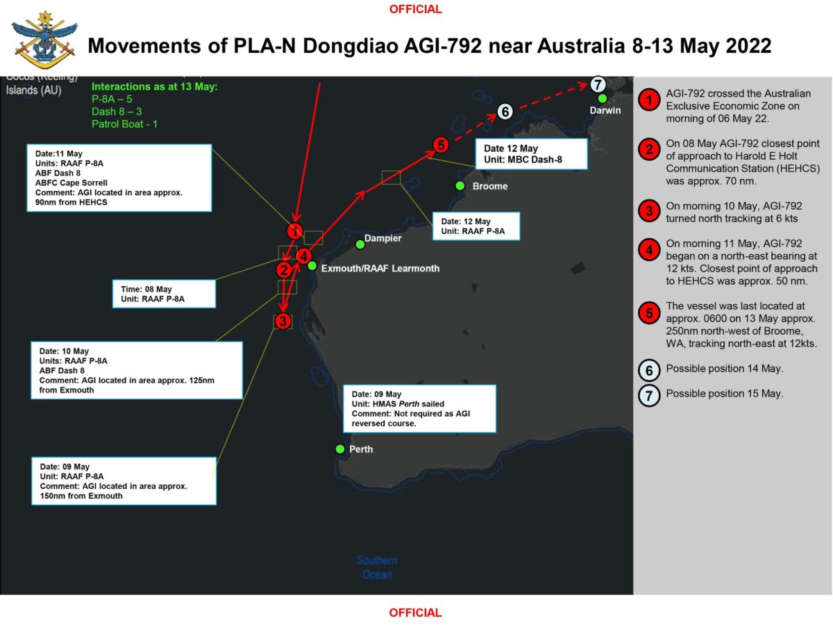 Στη συγκεκριμένη περίπτωση πρόκειται για το πλοίο «Haiwangxing» κλάσης Dongdiao Class, το οποίο μάλισtα πέρασε από τη Ζώνη Οικονομικού Αποκλεισμού της Αυστραλίας στις 6 Μαΐου και πλησίασε σε απόσταση 50 ναυτικών μιλίων από τον σταθμό επικοινωνίας στις 11 Μαΐου, ενώ η Καμπέρα έχει καθιερώσει την πρακτική ενημέρωσης του κοινού και του Τύπου για διάφορες «ύποπτες» πλεύσεις πλοίων και σκαφών του κινεζικού Πολεμικού Ναυτικού στις θαλάσσιες ζώνες ενδιαφέροντός της.