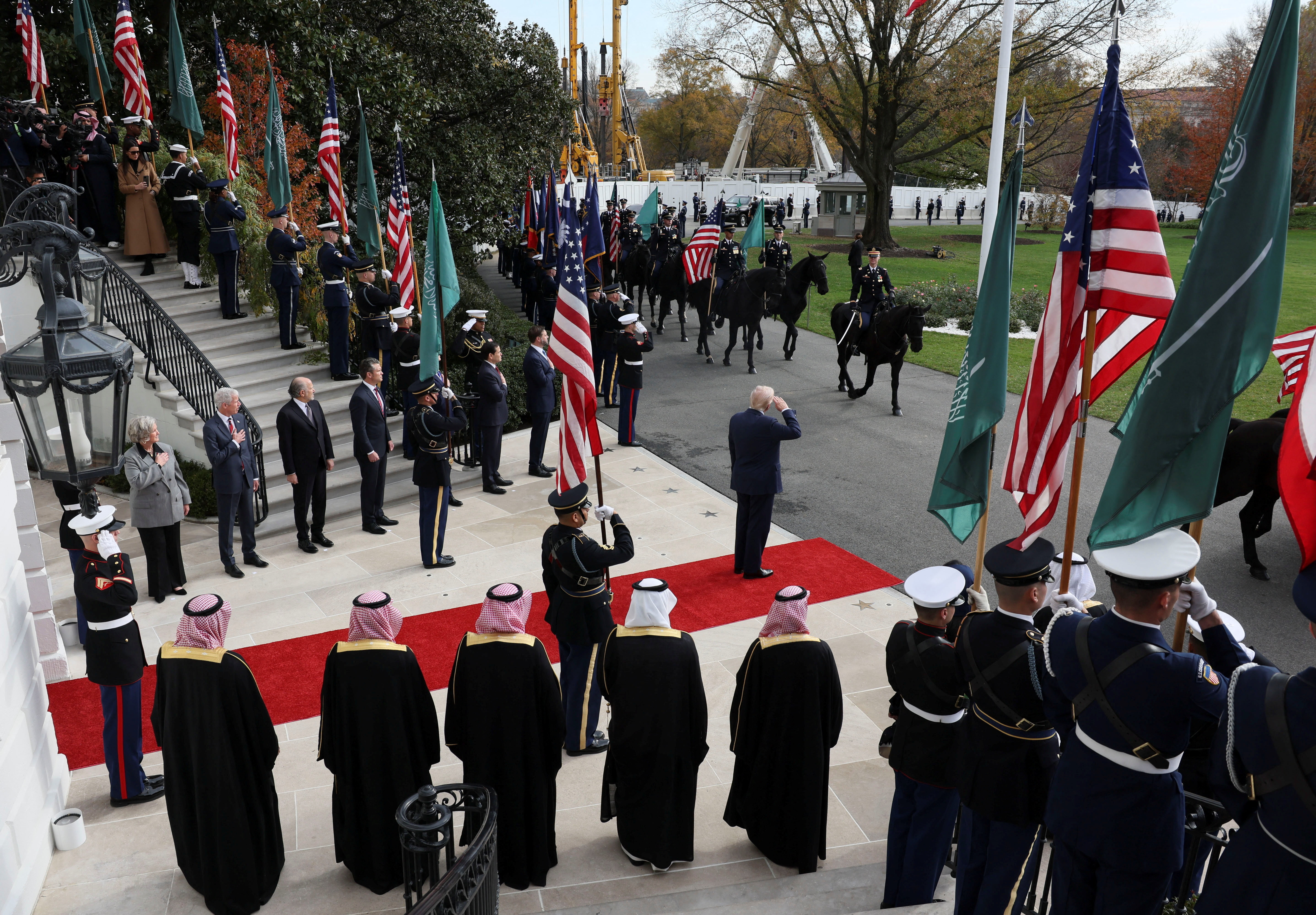 Ο Αμερικανός πρόεδρος υποδέχτηκε τον μπιν Σαλμάν με χαμόγελο και με χειραψία στο κόκκινο χαλί, την ώρα που δεκάδες στρατιωτικοί είχαν παραταχθεί περιμετρικά. Τη λιμουζίνα συνόδευσε τιμητική φρουρά του αμερικανικού στρατού. Οι δύο ηγέτες κοίταξαν κατόπιν στον ουρανό, ενώ μαχητικά αεροσκάφη πετούσαν, προτού ο Τραμπ οδηγήσει τον καλεσμένο του στο εσωτερικό.