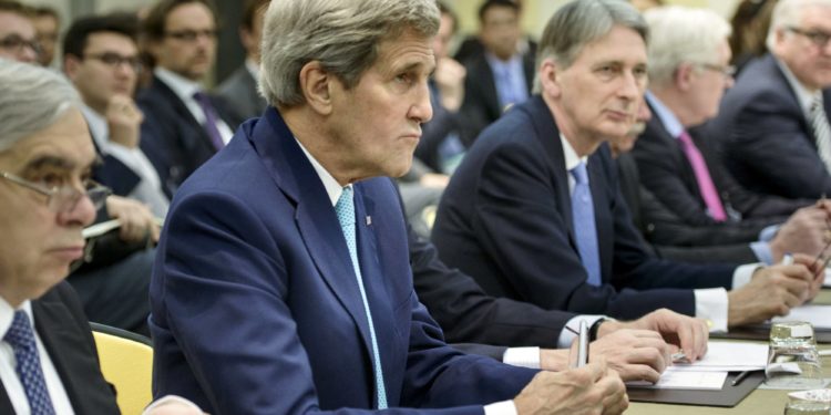 Φωτογραφία που έδωσε στη δημοσιότητα ο Λευκός Οίκος δείχνει τον Μπαράκ Ομπάμα να περιβάλλεται από συμβούλους, κατά τα φαινόμενα στην «αίθουσα εκτάκτων καταστάσεων» του Συμβουλίου Εθνικής Ασφαλείας, στο υπόγειο της Δυτικής Πτέρυγας του Λευκού Οίκου, να συνομιλεί μέσω των οθονών με τους Κέρι και Μονίζ που βρίσκονται στη Λωζάνη.
