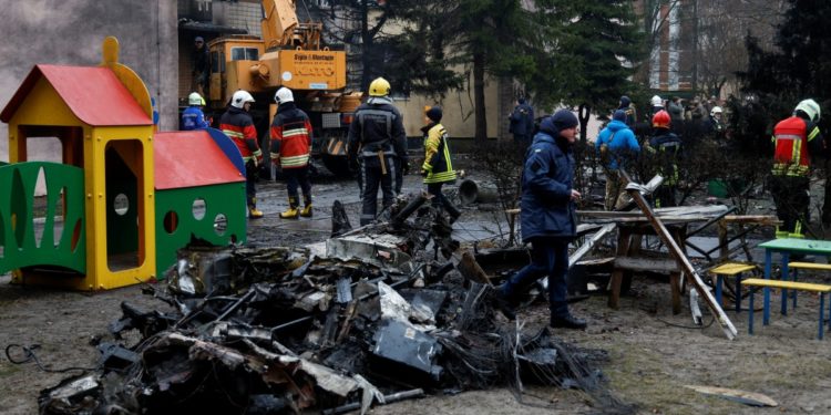 Το ελικόπτερο που μετέφερε τον Ουκρανό υπουργό Εσωτερικών Ντενίς Μοναστίρσκι, το οποίο συνετρίβη σήμερα κοντά στο Κίεβο, προκαλώντας τον θάνατο πολλών ανθρώπων – επισήμως 15 κατά τον Ζελένσκι, ανεπισήμως τουλάχιστον 18 – μεταξύ των οποίων ο αξιωματούχος και παιδιά, μετέβαινε στο μέτωπο, ανακοίνωσε σήμερα η ουκρανική προεδρία.