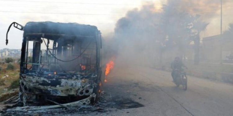 Τα κρατικά ΜΜΕ στη Συρία μεταδίδουν ότι “ένοπλοι τρομοκράτες” επιτέθηκαν σε πέντε λεωφορεία, τα οποία στη συνέχεια, πυρπολήθηκαν και καταστράφηκαν.