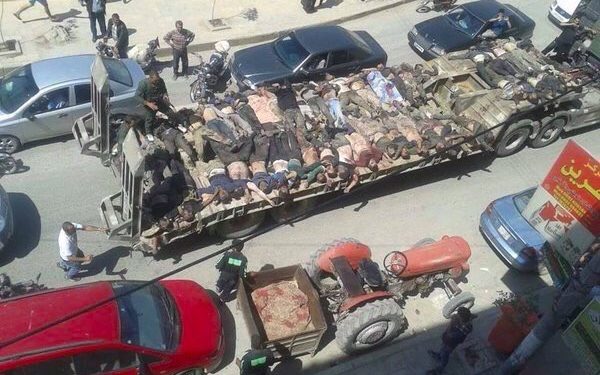 #ISIS style: The #YPG parades the bodies of dozens of killed Syrian rebels through the streets of #Afrin.#Syria pic.twitter.com/WqWjMEUX0n