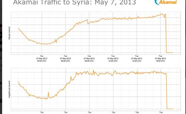 Η Διαδικτυακή κίνηση από και προς τη Συρία «εξαφανίστηκε» την Τρίτη, αναφέρει ιστοσελίδα που παρακολουθεί την διακίνηση πληροφοριών στο Ίντερνετ. Η διακίνηση δεδομένων μεταξύ της Συρίας και των «σέρβερ» της Google διεκόπη στις 21:00 GMT, σύμφωνα με την αμερικανική ιστοσελίδα Umbrella Security Labs.