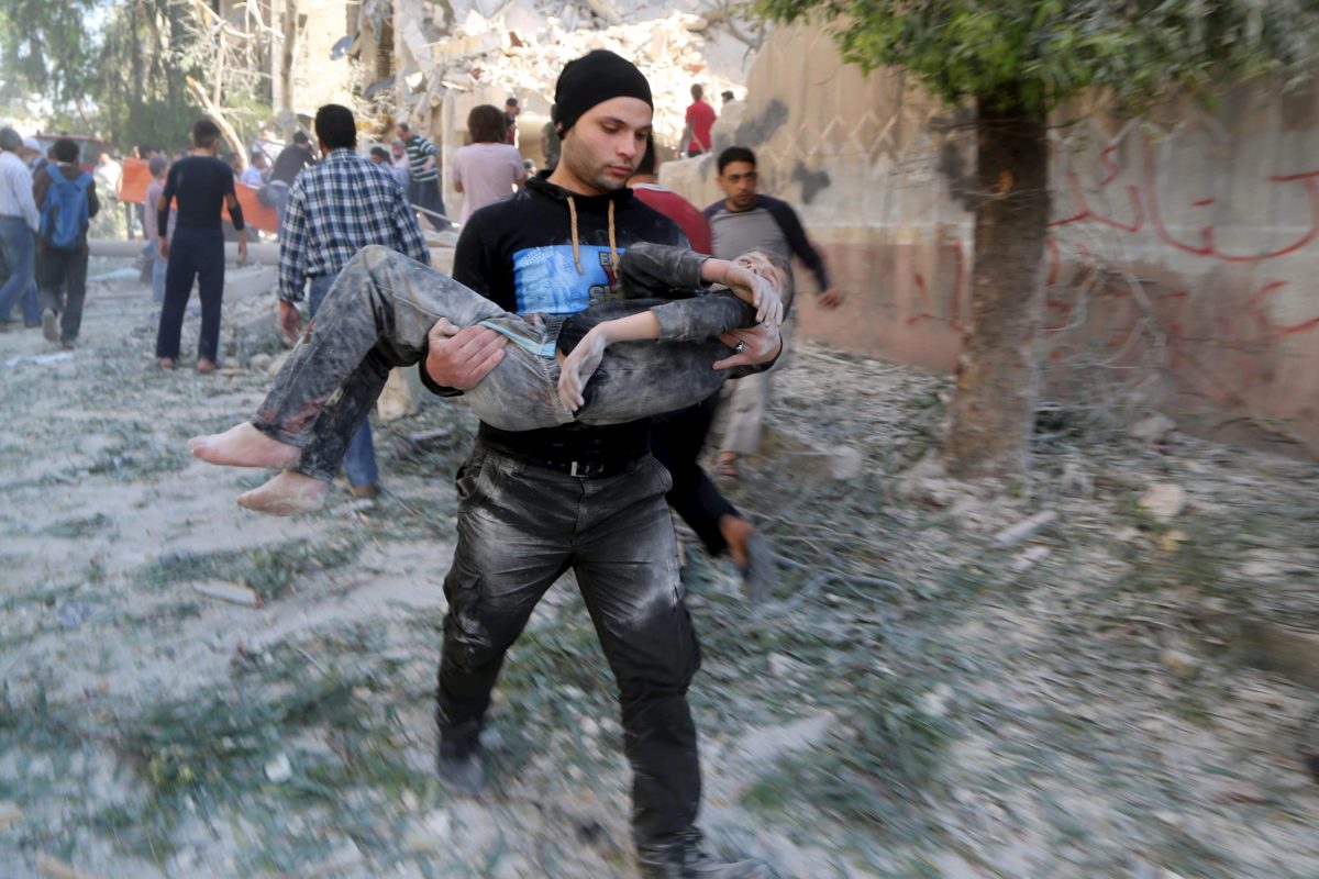 Φωτογραφία Reuters – Ένας άνδρας κρατά έναν τραυματισμένο αγόρι μετά – Σύμφωνα με ακτιβιστές η βόμβα ερρίφθη από δυνάμεις πιστές στον πρόεδρο Μπασάρ αλ-Άσαντ και χτύπησε ένα σχολείο και κατοικίες στη γειτονιά Seif al-Dawla του Χαλεπίου, χθες.