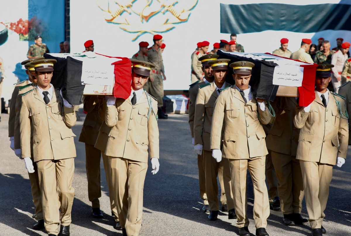 Τα φέρετρα ήταν τυλιγμένα με τη συριακή σημαία και μια στρατιωτική μπάντα έπαιζε πένθιμα εμβατήρια, ενώ στρατιωτικό άγημα απέδιδε τιμές.