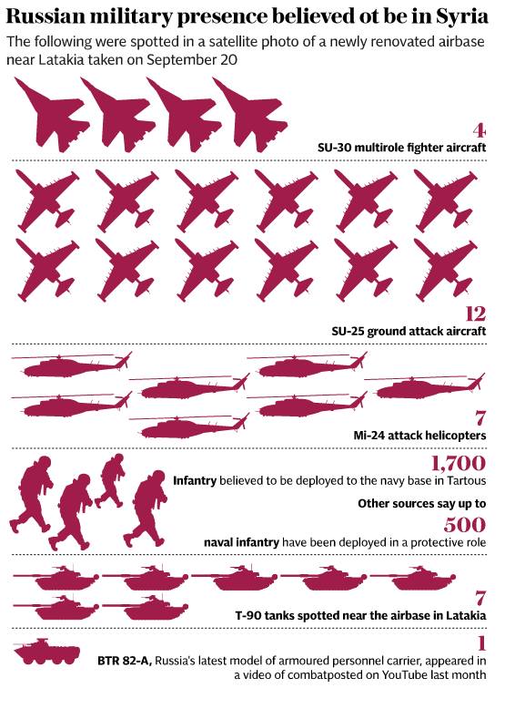 Σύμφωνα με τον κ.Παούνη οι Ρώσοι έκαναν χρήση “κυρίως bunker buster bombs (προφανώς ΚΑΒ-1500L), οι οποίες ερίφθησαν απο τα παλιά πλην όμως αξιόμαχα Su-24M Fencer, ενώ στη μάχη «ρίχτηκαν» τα σχετικά νεότευκτα Su-30 & Su-34 με ικανότητα μεταφοράς οπλικού φορτίου που αγγίζει τους 12 τόνους. Οι στόχοι καταδεικνύονται από UAV’s (Orlan, Pchela, Skat ή ΖALA). Η Π.Α. της Ρωσίας προσέβαλλε μεταξύ άλλων, θέσεις των ανταρτών της αντιπολίτευσης είτε εξαιτίας λαθεμένης κατάδειξης, είτε εσκεμμένα, θέλοντας να καταστήσει σαφές οτι επιθυμεί την παραμονή Assad στο τιμόνι της χώρας, ή έστω την ομαλή μετάβαση στον εκδημοκρατισμό της Συρίας, ΧΩΡΙΣ να θιγεί σε καμία περίπτωση η ικανότητα ελλιμενισμού ρωσικών σκαφών σε λιμένες όπως της Λαττάκιας, Ταρτούς κ.α.”