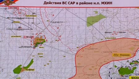 Ένας χάρτης στον οποίο απεικονίζονται οι ρωσικές στρατιωτικές επιχειρήσεις στη Συρία, πλάνα με τον οποίο συμπεριλήφθηκαν σε ρεπορτάζ της ρωσικής δημόσιας τηλεόρασης, αφήνει να εννοηθεί ότι μονάδα του ρωσικού πυροβολικού δρα στην επαρχία Χομς της Συρίας, παρά το γεγονός ότι ο πρόεδρος Βλαντίμιρ Πούτιν έχει διαψεύσει επανειλημμένα την παρουσία ρωσικών χερσαίων δυνάμεων στο συριακό έδαφος.