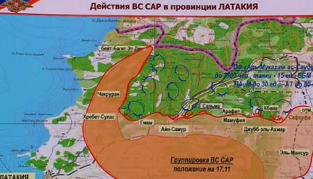 Ένας χάρτης στον οποίο απεικονίζονται οι ρωσικές στρατιωτικές επιχειρήσεις στη Συρία, πλάνα με τον οποίο συμπεριλήφθηκαν σε ρεπορτάζ της ρωσικής δημόσιας τηλεόρασης, αφήνει να εννοηθεί ότι μονάδα του ρωσικού πυροβολικού δρα στην επαρχία Χομς της Συρίας, παρά το γεγονός ότι ο πρόεδρος Βλαντίμιρ Πούτιν έχει διαψεύσει επανειλημμένα την παρουσία ρωσικών χερσαίων δυνάμεων στο συριακό έδαφος.