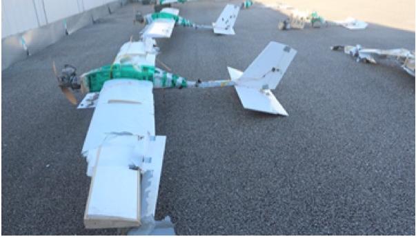 Στην φωτογραφία διακρίνονται τρία μη επανδρωμένα αεροσκάφη, αυτοσχέδιας κατασκευής, που είναι φτιαγμένα από κόντρα πλακέ. Τα μη επανδρωμένα αεροσκάφη έχουν κολλητική ταινία πράσινου χρώματος, με την οποία καλύπτονται κάποια καλώδια. Πίσω από αυτά διακρίνονται τα συντρίμμια τριών ακόμη μη επανδρωμένων αεροσκαφών τα οποία καταρρίφθηκαν και καταστράφηκαν κατά την πρόσκρουση τους στο έδαφος