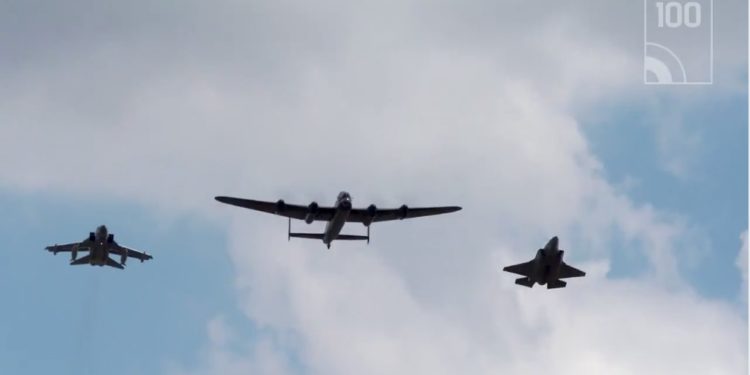 Στον μέσο του σχηματισμού, το παρελθόν της RAF, το τετρακινητήριο Lancaster του Β’ ΠΠ. Συνοδοί του το 5ης γενιάς stealth μαχητικό F-35 που εντάσσεται αυτή την περίοδο στην RAF αλλά και στον στόλο του Royal Navy, και φυσικά οι προκάτοχοι των F-35 τα Tornado.