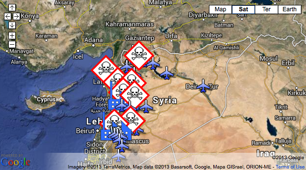 Ο παραπάνω χάρτης δείχνει περιοχές οπου πιθανότατα να υπάρχουν χημικά όπλα στη Συρία όπως και τις θέσεις των αεροπορικών βάσεων.