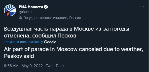 Kremlin Spokesperson Dmitry Peskov told RIA that the air parade over #Moscow was cancelled due to the weather