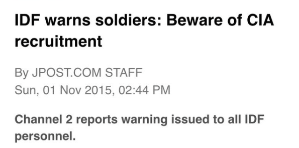 Οι αξιωματικοί και στρατιώτες της Tzahal , έχουν λάβει πρόσφατα προειδοποίηση από το Τμήμα Ασφάλειας Πληροφοριών, ένα σώμα αντικατασκοπίας της στρατιωτικής υπηρεσίας πληροφοριών , να προσέξουν πιθανές απόπειρες στρατολόγησης από την Κεντρική Υπηρεσία Πληροφοριών των Ηνωμένων Πολιτειών , σύμφωνα με μια έκθεση που αποκαλύφθηκε από το ισραηλινό κανάλι Channel 2 .