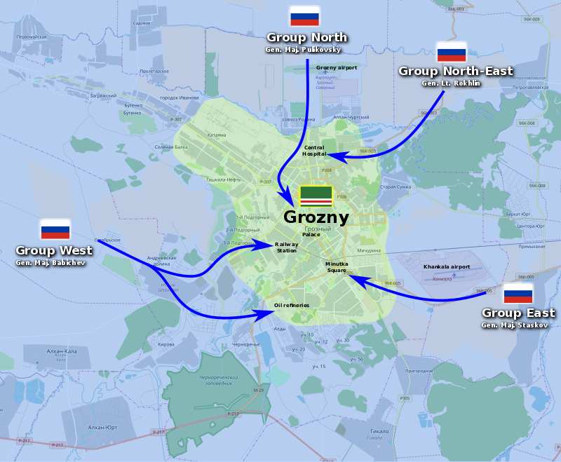 Κύριοι στόχοι τους ήταν το στρατιωτικό και το πολιτικό αεροδρόμιο της πόλης, η έδρα διοίκησης των ρωσικών δυνάμεων, τα αρχηγεία των ρωσικών υπηρεσιών FSB και GRU και κέντρα επικοινωνιών. Οι Τσετσένοι κατάφεραν να διεισδύσουν υφιστάμενοι ελάχιστες απώλειες (47 άνδρες) και να θέσουν υπό τον έλεγχό τους, ουσιαστικά, την πόλη εντός μόλις τριών ωρών ξεκινώντας από τις 05.50 το πρωί.
