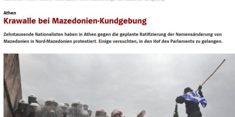 «Οι διαδηλωτές κρατούσαν ελληνικές σημαίες και φώναζαν συνθήματα όπως ‘Προδότες-Πολιτικοί’. Έριξαν πέτρες άλλα αντικείμενα και πυροτεχνήματα στους αστυνομικούς, σύμφωνα με ΜΜΕ ενώ ψιλιάδες ειρηνικοί διαδηλωτές– μεταξύ των οποίων και οικογένειες – αναγκάστηκαν να διαφύγουν πανικόβλητοι», γράφει το Spiegel περιγράφοντας έτσι την κατάσταση στο κέντρο της Αθήνας στο συλλαλητήριο.