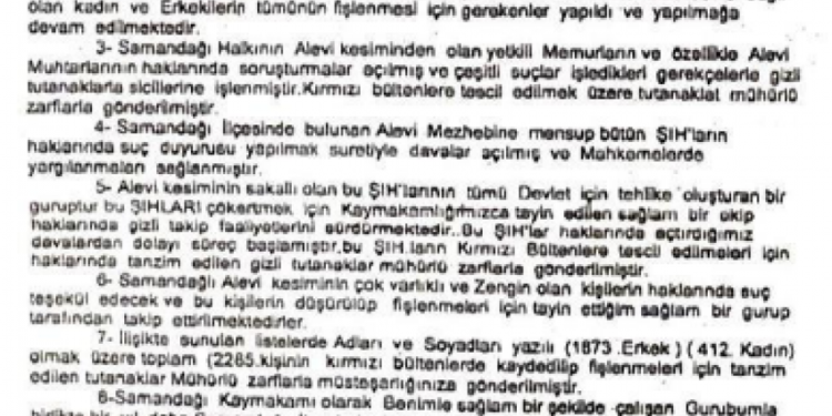 Για όλους τους άντρες και γυναίκες που είναι μέλη στο αλεβίτικο δόγμα στο Σαμαντάγ, έγιναν και γίνονται τα δέοντα για το φακέλωμα τους”.