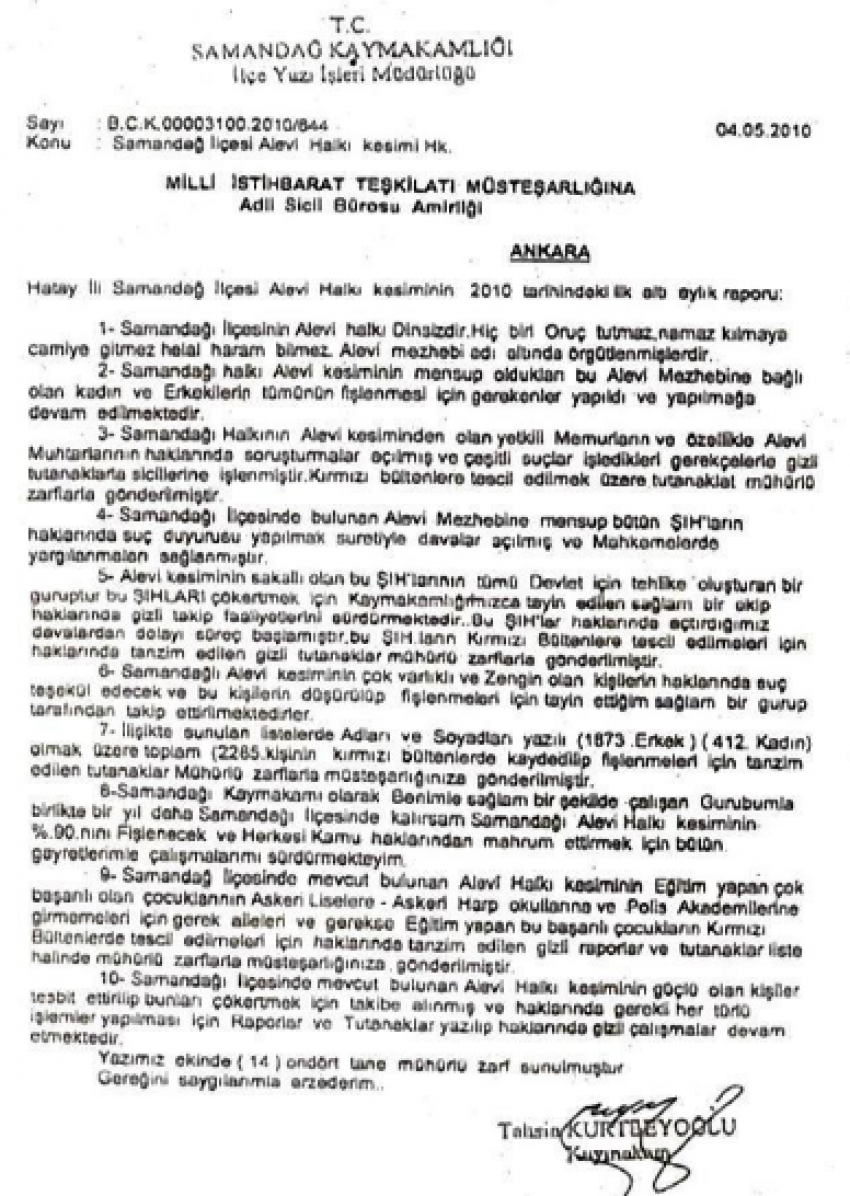 Για όλους τους άντρες και γυναίκες που είναι μέλη στο αλεβίτικο δόγμα στο Σαμαντάγ, έγιναν και γίνονται τα δέοντα για το φακέλωμα τους”.