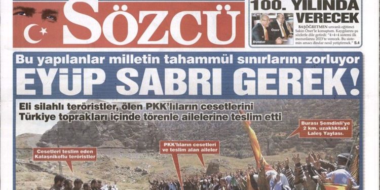 «Χρειάζεται μεγάλη υπομονή» είναι ο τίτλος της Sözcü. H τουρκική εφημερίδα αναφέρει πως «αυτά που συμβαίνουν ζορίζουν τα όρια του τουρκικού λαού» και δείχνει τη φωτογραφία όπου αντάρτες του PKK εντός της Τουρκίας παραδίδουν με τελετή τις σορούς των ανταρτών που σκοτώθηκαν στις μάχες με τον τουρκικό στρατό.
