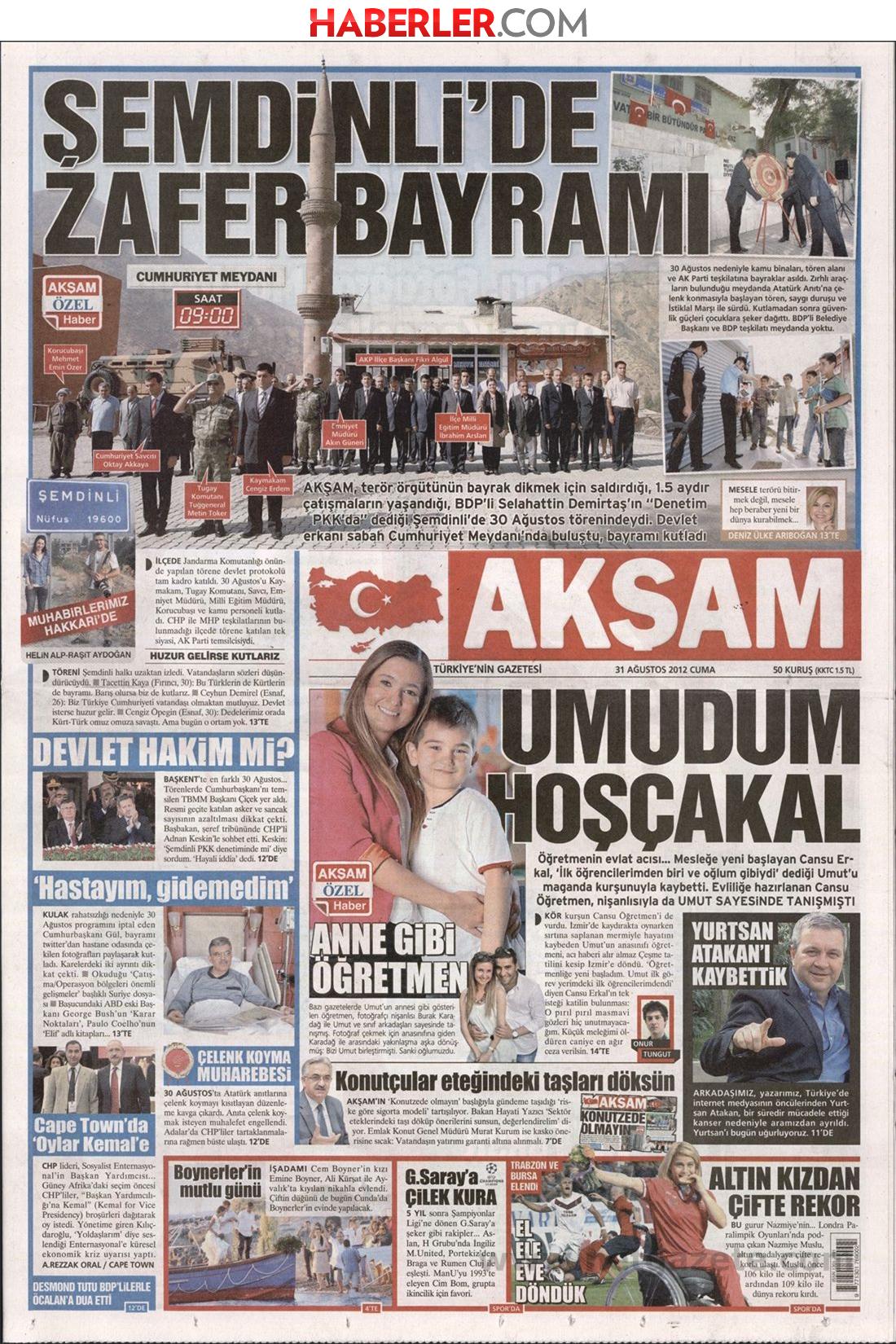 «Ημέρα εθνικής γιορτής στο Σεμντίνλι» είναι ο τίτλος της Akşam. H τουρκική εφημερίδα σε μια προσπάθεια να δείξει πως το Σεμντίνλι είναι ακόμη στα χέρια του τουρκικού κράτους, και όχι του PKK, δημοσιεύει φωτογραφίες από την τελετή που πραγματοποιήθηκε στην περιοχή.