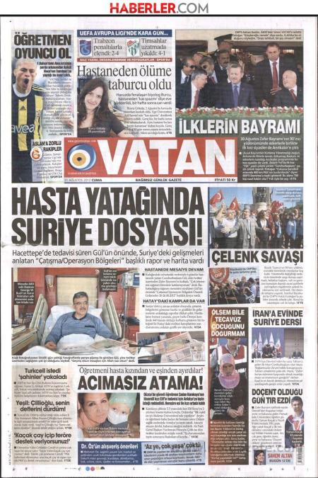 « Στο κρεβάτι το αρρώστου ο φάκελος της Συρίας» είναι ο τίτλος της Vatan. H τουρκική εφημερίδα αναφέρει πως ο πρόεδρος της Τουρκίας Αμντουλάχ Γκιούλ , ο οποίος νοσηλεύεται με ασθένεια στο αυτί του μελετά την υπόθεση της Συρίας. Στο φάκελο αναφέρεται « τα σημεία επέμβασης στη Συρία».