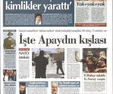 «Αυτό είναι το στρατόπεδο του Άπαγντιν» είναι ο τίτλος της Cumhuriyet. H τουρκική εφημερίδα αναφέρει πως το κέντρο φιλοξενίας προσφύγων του Άπαγντιν, στην Αντιόχειο στην Τουρκία, στην πραγματικότητα είναι κέντρο διοίκησης τους στρατού της αντιπολίτευσης της Συρίας. Η Cumhuriyet αναφέρει πως στο κέντρο αυτό φιλοξενούνται 386 αξιωματικοί και 72 υπαξιωματικοί του στρατού της Συρίας , οι οποίοι όμως τώρα πολεμούν τον Άσαντ. Σύμφωνα με πληροφορίες της εφημερίδας ανάμεσα στους αξιωματικούς είναι και δυο στρατηγοί!