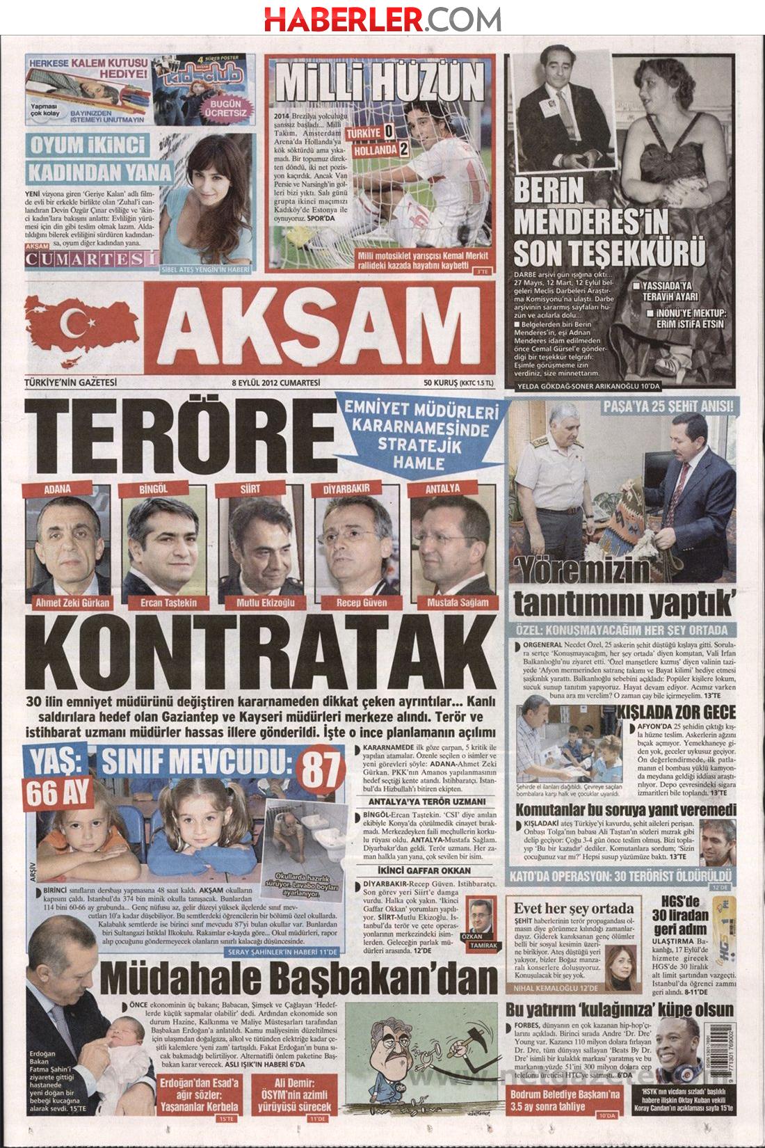 «Αντεπίθεση στην τρομοκρατία» είναι ο τίτλος της Akşam. H τουρκική εφημερίδα αναφέρει πως έγιναν αλλαγές στις θέσεις των 30 διευθυντών ασφαλείας πολλών πόλεων όπως του Γκαζίαντεπ και της Καισάρειας που είχαν γίνει στόχοι τρομοκρατικών επιθέσεων. Η εφημερίδα θεωρεί πως οι αλλαγές αυτές μπορούν να φέρουν αποτελέσματα στην καταπολέμηση της τρομοκρατίας.