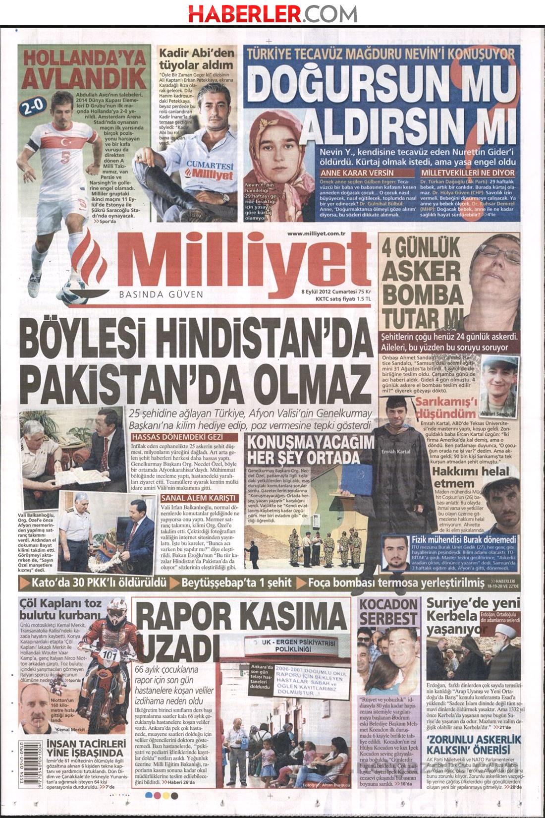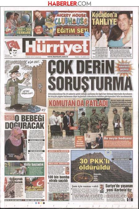 «Αυτά δεν γίνονται ούτε στο Πακιστάν, ούτε στο Αφγαανιστάν” είναι ο τίτλος της Milliyet. Η τουρκική εφημερίδα αναφέρεται στο θέμα της επίσκεψης του αρχηγού των τουρκικών ενόπλων δυνάμεων Νετζντέτ Οζέλ, στο Αφγιονκαράχισαρ όπου είχαν σκοτωθεί 25 στρατιώτες. Ο νομάρχης της πόλης του έκανε διάφορα αναμνηστικά δώρα όπου η Milliyet αντέδρασε έντονα με τον τίτλος της και ανέφερε πως ‘όταν έχουν σκοτωθεί 25 στρατιώτες δεν μπορούν να δίνονται αναμνηστικά δώρα».