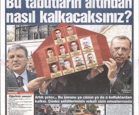 « Πως θα σηκωθείτε κάτω απ’αυτά τα φέρετρα» ο τίτλος της Sözcü. H τουρκική εφημερίδα κάνει αναφορά στην επίθεση του PKK στη Ν.Α Τουρκία με τους 10 νεκρούς στρατιώτες.