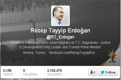 Ο πραγματικός λογαριασμός του κ. Ερντογάν στο Twitter (@ RT_Erdogan ) ακολουθείται από πάνω από 3 εκατ. άτομα, γεγονός που τον κατατάσσει στους πιο δημοφιλείς λογαριασμούς στην Τουρκία.Ο λογαριασμός  ελέγχεται από το γραφείο του, και με αυτόν στέλνει ενημερώσεις από τις ομιλίες του.Ο   ίδιος ο Τούρκος  Πρωθυπουργός δε θεωρείται ότι τρέφει συμπάθεια στα μέσα κοινωνικής δικτύωσης. Τον περασμένο μήνα, μάλιστα, κατά τη διάρκεια των επεισοδίων χαρακτήρισε σε τηλεοπτική συνέντευξη το Twitter «απειλή»: «Υπάρχει η απειλή που ονομάζεται Twitter. Απόλυτα και αδικαιολόγητα ψέματα αναρτώνται στο Twitter», δήλωσε ο κ. Ερντογάν και κατέληξε : «Ό,τι αποτελεί μέσο κοινωνικής δικτύωσης δημιουργεί πρόβλημα στις σημερινές κοινωνίες».