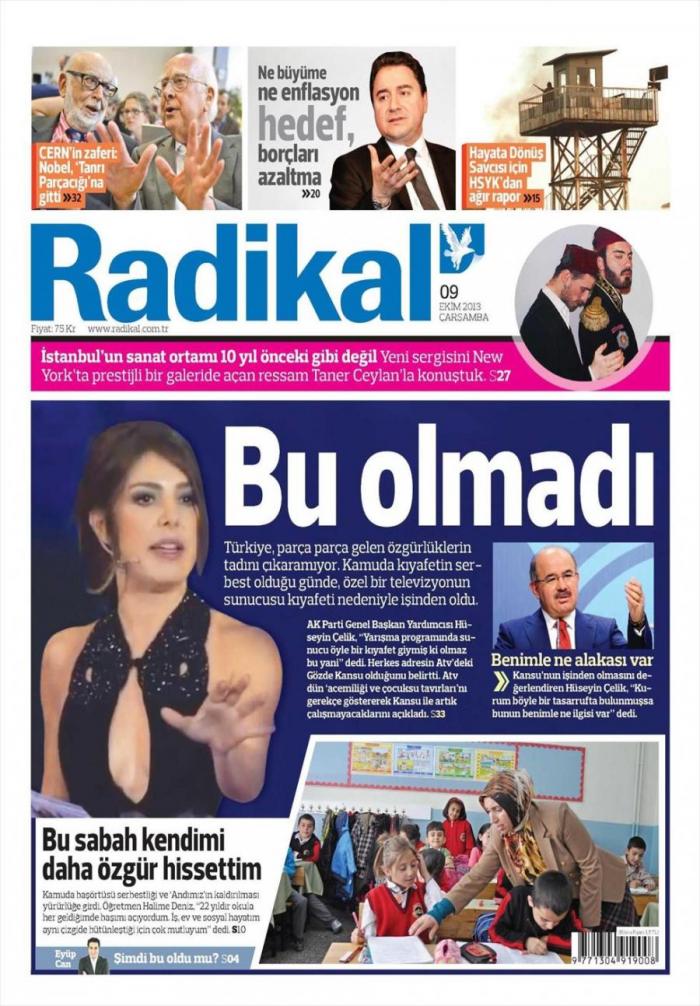 «Αυτό δεν ταίριαξε» είναι ο τίτλος της Radikal. «H Τουρκία δεν μπορεί να απολαύσει τις ελευθερίες που έρχονται λίγο λίγο. Την ημέρα που απελευθερώθηκε η μαντίλα στην Τουρκία, την ίδια ώρα απολύθηκε μια παρουσιάστρια εκπομπής ιδιωτικού τηλεοπτικού δικτύου λόγω του φορέματος της» γράφει η τουρκική εφημερίδα. «Τι σχέση έχω εγώ αυτή είναι μια απόφαση του τηλεοπτικού δικτύου» φέρεται να δηλώνει ο Τσελίκ όμως όλοι στην Τουρκία θεωρούν πως οι κατηγορίες που εξαπέλυσε εναντίον της Κάνσου ήταν ο μόνος λόγος της απόλυσης της.