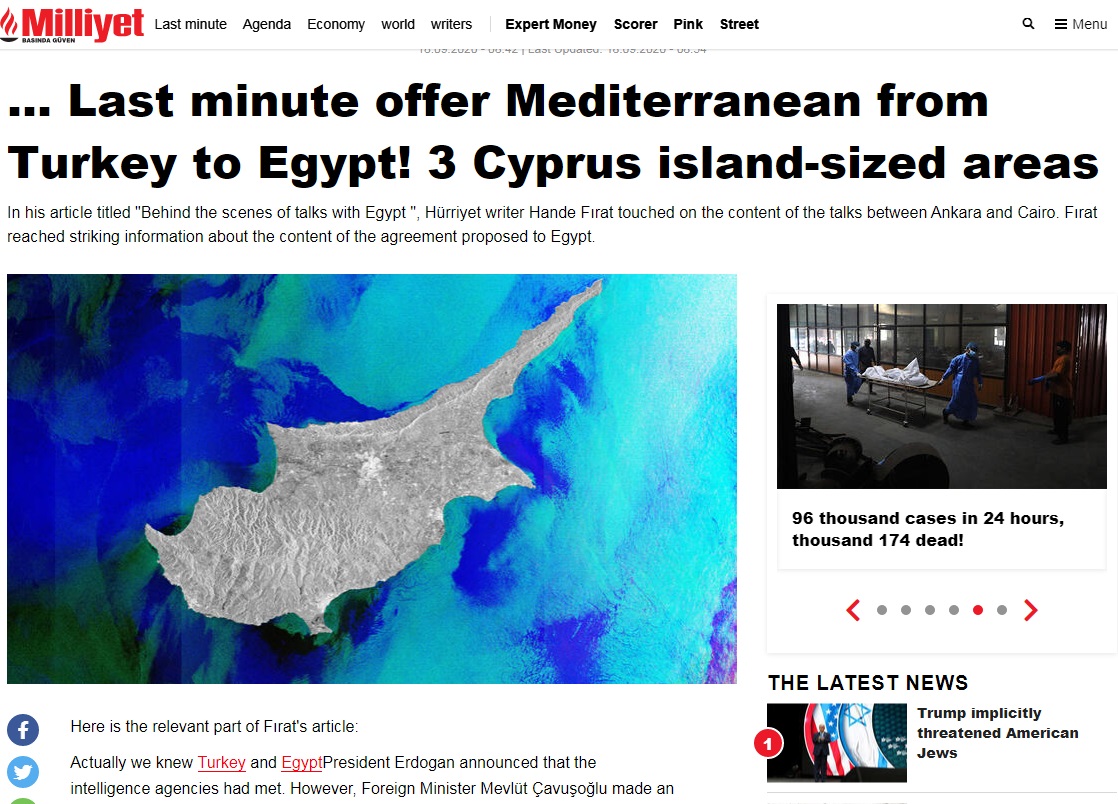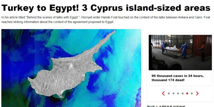 Όπως αναφέρει σήμερα ο δημοσιογράφος της Hurriyet, Hande Fırat, και αναδημοσιεύει η Milliyet, η Τουρκία προσφέρει στην Αίγυπτο θαλάσσια περιοχή μεγέθους όσο τρεις φορές η έκταση της Κύπρου, για να υπογράψουν συμφωνία ΑΟΖ.