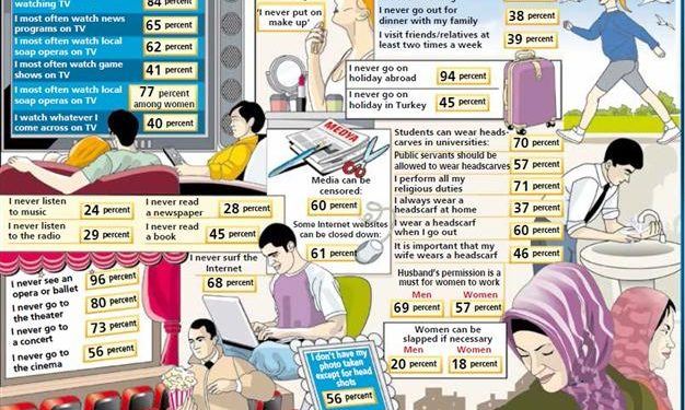 Στοιχεία -σοκ για το επίπεδο της ζωής στην Τουρκία προκύπτουν από πρόσφατη έρευνα κοινής γνώμης ( γκάλοπ) που διεξήγαγε η εταιρεία Ipsos KMG για λογαριασμό της τουρκικής εφημερίδας Posta αναφορικά με τις στάσεις και τις προτιμήσεις των Τούρκων, που μεταξύ άλλων αποδέχονται την λογοκρισία (60%), το χαστούκισμα της γυναίκας (20%), κλπ κλπ.