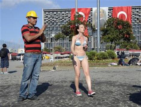 Όπως αναφέρεται στον τύπο και στις ιστοσελίδες, στα παράπλευρα στενά της πλατείας του Ταξίμ, αλλά και στην πλατεία αυτή της Κωνσταντινο΄πολης συνεχίστηκε η »ακίνητη διαμαρτυρία» από πολλά άτομα, ενώ από νωρίς παρουσιάστηκε άλλο είδος διαμαρτυρίας, όταν μία νεαρή με μπικίνι μπήκε στην πλατεία για να διαμαρτυρηθεί, στεκόμενη ακίνητη.H Mine Dost εμφανίστηκε ξαφνικά μπροστά από τούς διαδηλωτές – οι οποίοι στέκονταν σιωπηλά κοιτάζοντας το Πολιτιστικό Κέντρο Ατατούρκ, φορώντας μόνο ένα μπικίνι και αθλητικά παπούτσια- χόρευε. Είπε ότι είχε γεννηθεί στη Γερμανία.«Ήθελα να κάνω τους ανθρώπους να σκέφτονται με το χορό μου. Η Ελευθερία πρέπει να έρθει στην Τουρκία», είπε. Ωστόσο, κάποιοι από τους διαδηλωτές δεν υιοθετησαν την πρωτοβουλία της. Ορισμένοι διαδηλωτές την κατηγόρησε ότι «κάνει μια επίδειξη από τον εαυτό της», ενώ μια γυναίκα φώναξε θυμωμένα τόσο στην κ. Dost όσο και σε όσους την παρακολουθούσαν. Αυτή αργότερα έφυγε από την πλατεία, αλλά είπε ότι θα επιστρέψει. Επανεμφανίστηκε στην πλατεία τις βραδινές ώρες και επανέλαβε την πράξη της. Αυτή τη φορά, όμως, η αστυνομία παρενέβη και την συνέλαβε.