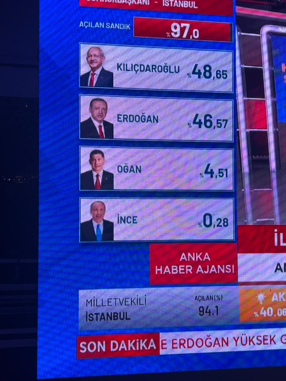 Μάλιστα το δίκτυο ANKA που πρόσκειται στην τουρκική αντιπολίτευση έδειχνε τον Κιλιτσντάρογλου να προηγείται, με καταμετρημένο το 97% των ψήφων: