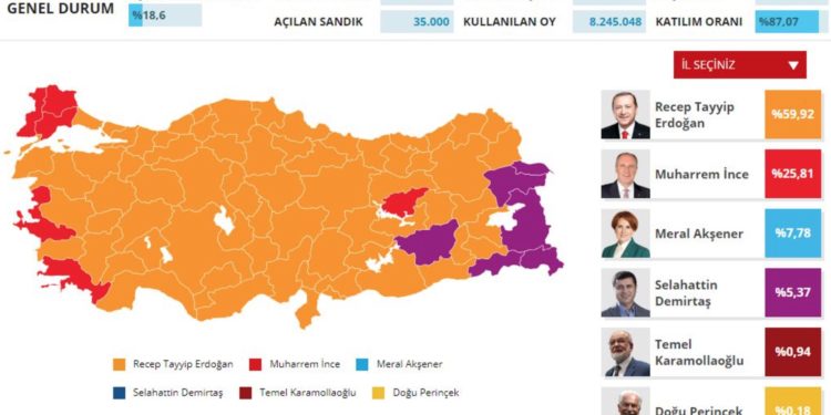 Συγκεκριμένα με την καταμέτρηση πάνω από το 18%, ο «Σουλτάνος» συγκεντρώνει 59,92% ενώ ο μεγάλος αντίπαλός του Μουχαρέμ Ιντζέ λαμβάνει λιγότερες από μια στις τρεις ψήφους, με ποσοστό που διαμορφώνεται στο 25,81%. Στο 7,78% είναι η δύναμη της Μεράλ Ακσενέρ και αρκετά χαμηλότερα του φυλακισμένου υποψηφίου του φιλοκουρδικού κόμματος HDP, Σελαχετίν Ντεμιρτάς.