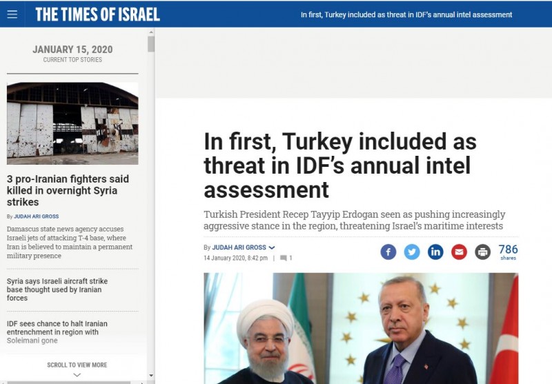 Σύμφωνα με δημοσίευμα της Times of Israel, αν και στην αξιολόγηση που παρουσιάζεται κάθε χρόνο στους ισραηλινούς υπεύθυνους για τη λήψη αποφάσεων ο στρατός δεν βλέπει άμεση αντιπαράθεση με την Τουρκία στην εκκίνηση το 2020, οι όλο και πιο επιπόλαιες ενέργειες Άγκυρας στην περιοχή, την κατέστησαν έναν από τους κορυφαίους κινδύνους για παρακολούθηση για τα επόμενα χρόνια.
