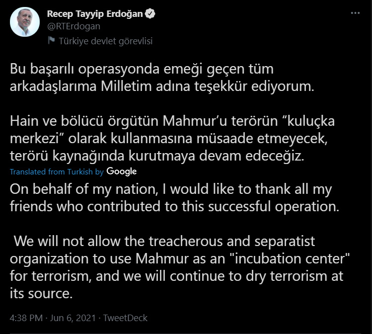 «Δεν θα επιτρέψουμε αυτή η αυτονομιστική και ολέθρια οργάνωση να χρησιμοποιεί το Μαχμούρ ως επωαστήρα τρομοκρατίας. Θα συνεχίσουμε να εξολοθρεύουμε την τρομοκρατία στην πηγή της», ανέφερε σε ανάρτησή του στο Twitter ο Τούρκος πρόεδρος Ερντογάν.