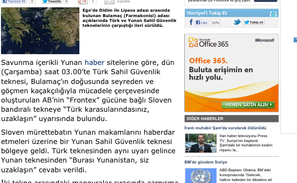 Η μόνη αναφορά που υπάρχει στο διαδίκτυο είναι της εφημερίδας Hürriyet, που αντλεί τις τις πληροφορίες που μεταδίδουν « οι ελληνικες ιστοσελίδες με θέματα άμυνας» όπως γράφει η εφημερίδα. « Μίνι ένταση» είναι ο τίτλος που χρησιμοποιεί η εφημερίδα και αναφέρεται στις πληροφορίες που γράφονται στην Ελλάδα.