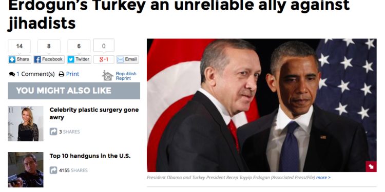 Άρθρο κόλαφος για τον Ερντογάν και την στάση του απέναντι στους τζιχαντιστές. Ούτε λίγο ,ούτε πολύ χαρακτηρίζεται αναξιόπιστος. Το άρθρο της εφημερίδας Washington Times έχει τίτλο : “Η Τουρκία του Ερντογάν ένας αναξιόπιστος σύμμαχος έναντι των τζιχαντιστών” και υπογράφεται από τον Τσάρλ Ορτέλ.