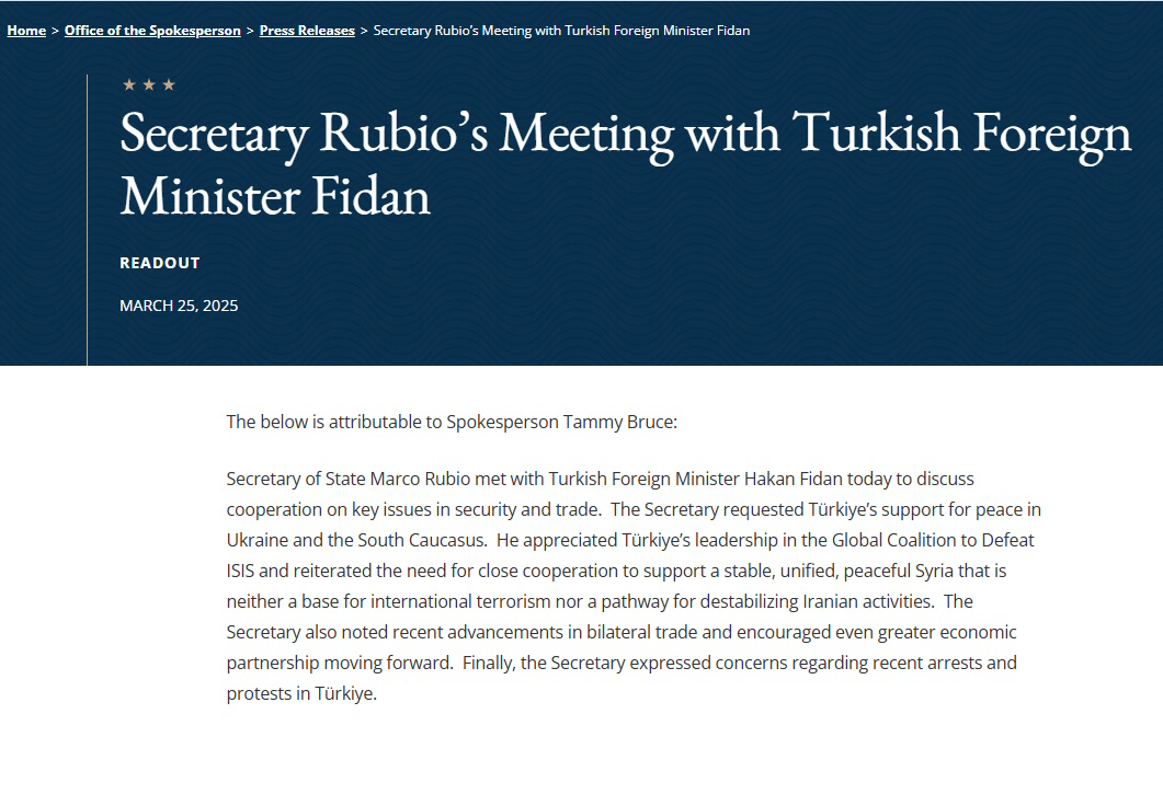«Ο υπουργός Εξωτερικών εξέφρασε τις ανησυχίες του σχετικά με τις συλλήψεις και τις διαδηλώσεις στην Τουρκία», αναφέρει ανακοίνωση του Στέιτ Ντιπάρτμεντ που εκδόθηκε μετά την συνάντηση, στην πρώτη επίσημη αντίδραση της κυβέρνησης Τραμπ στα γεγονότα των τελευταίων ημερών στην Τουρκία.
