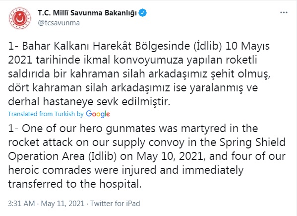 🇹🇷Turkish Armed Forces target identified positions after a rocket attack on its convoy in Syria's Idlib leaves one soldier dead and another four injured – Turkish Defence Ministry#Turkey #Syria #Idlib pic.twitter.com/DWH60TvUOM