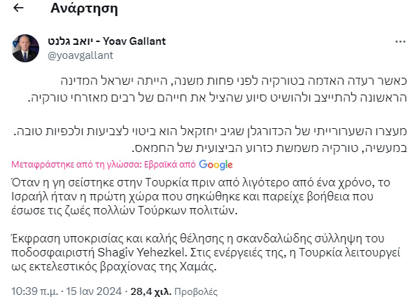 Σε ανάρτησή του στο Χ (Twitter), ο Γιόαβ Γκάλαντ υπενθύμισε στην Τουρκία την ταχεία συνδρομή του Ισραήλ μετά τον καταστροφικό σεισμό του περασμένου έτους και χαρακτήρισε την μεταχείριση του Σαγκίβ Γεχεζκέλ «σκανδαλώδη εκδήλωση υποκρισίας και αγνωμοσύνης».