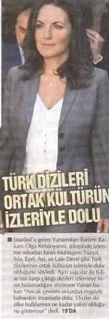 Η εφημερίδα αναφέρει πως η ελληνίδα υπουργός δήλωσε πως “η Κεφαλογιάννη ανέφερε πως οι σειρές αυτές είναι γεμάτες με στοιχεία τα κοινά που έχουν οι πολιτισμοί των δυο χωρών. « Δεν έχω χρόνο να βλέπω τις σειρές αυτές , όμως έχω κόσμο γύρω μου που τις βλέπει και μιλά συνέχεια γι’ αυτές. Οι σειρές αυτές δείχνουν το πόσο κοντά είναι οι δυο λαοί»” φέρεται να δηλώνει η ελληνίδα υπουργός Τουρισμού.