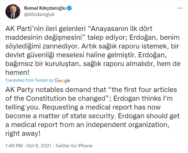 «Είναι ζήτημα κρατικής ασφάλειας να ζητήσουμε μια αναφορά καλής υγείας. Ο Ερντογάν πρέπει να λάβει έκθεση υγείας από ανεξάρτητο ίδρυμα και να το κάνει αμέσως», έγραψε χαρακτηριστικά.
